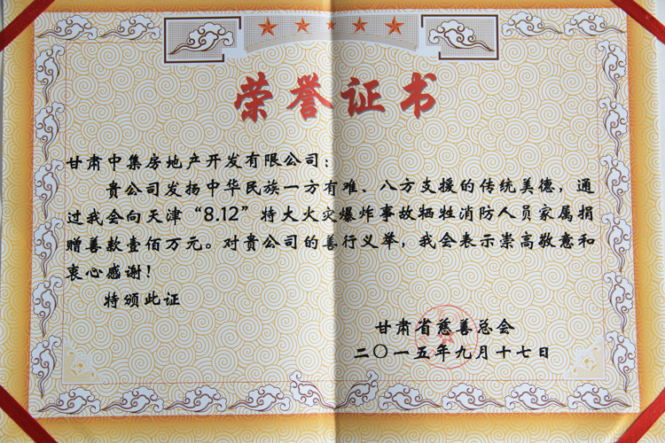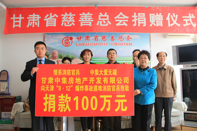 2015年8月12日23時30分,天津?yàn)I海新區(qū)國際物流中心發(fā)生重大爆炸火災(zāi)事故,造成重大人員傷亡。甘肅中集房地產(chǎn)開發(fā)有限公司總經(jīng)理周啟濤獲悉后,決定為在本次事故中犧牲的消防官兵及其家屬捐款100萬元,用于幫助犧牲消防官兵家屬善后事宜的處理,以盡一份甘肅企業(yè)的慈善愛心。